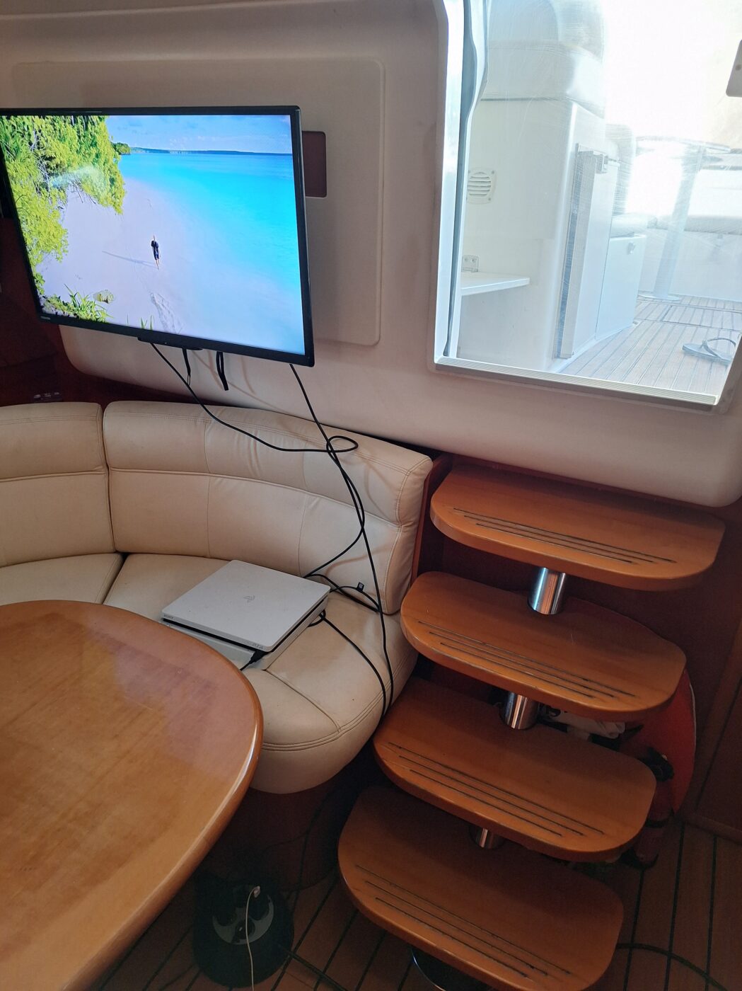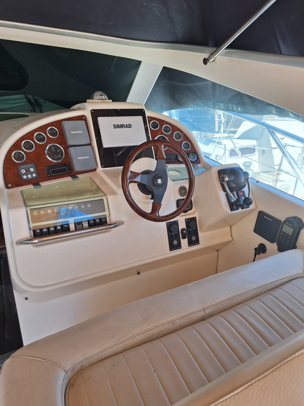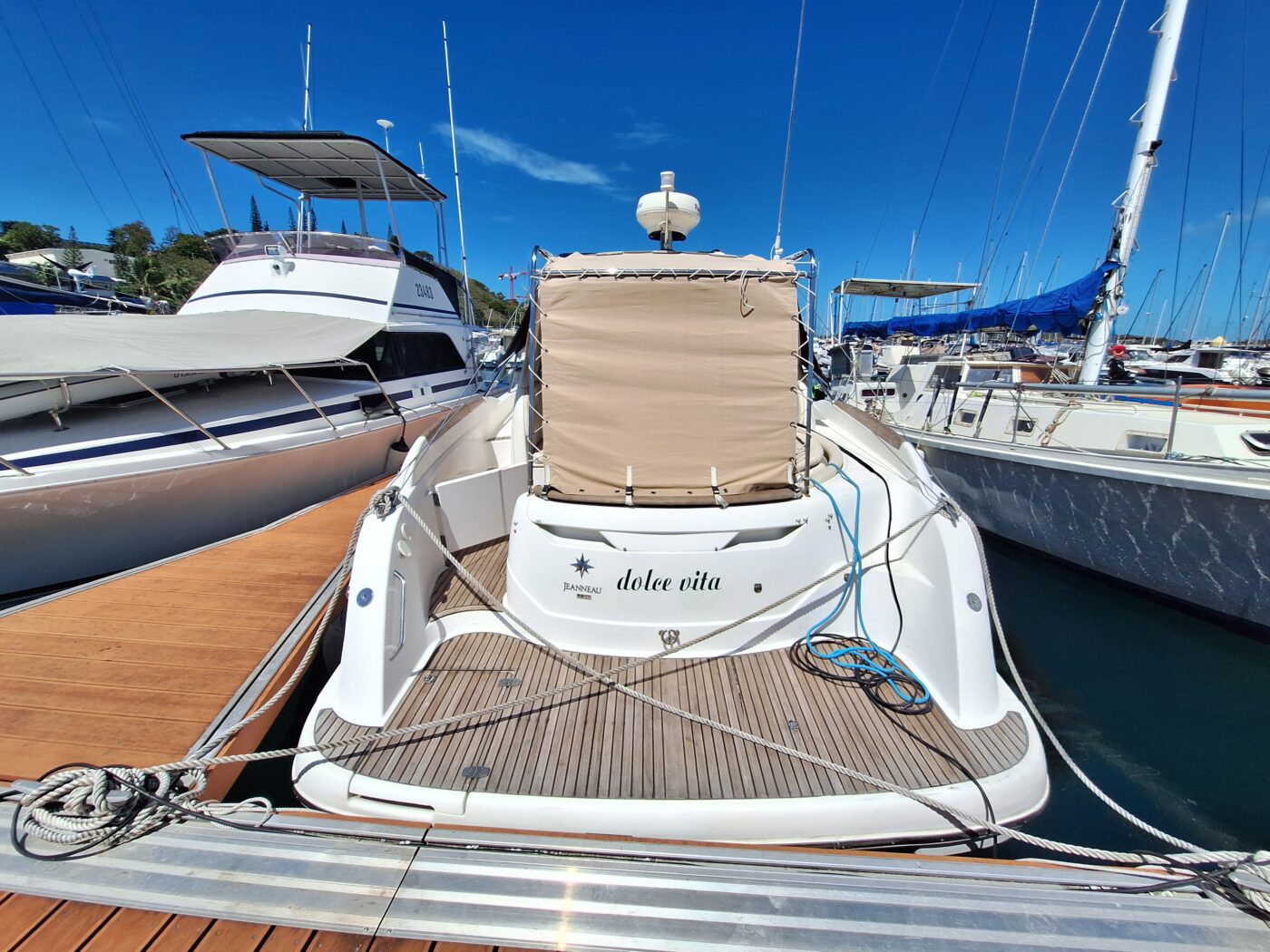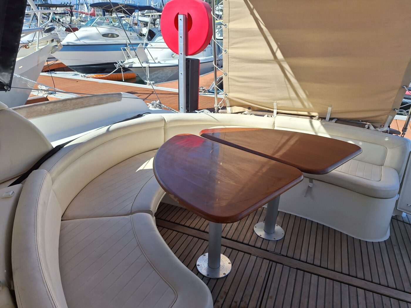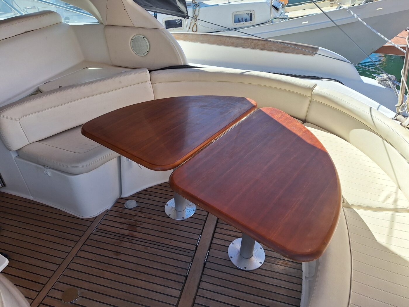 Le cockpit, habillé d’un superbe teck, offre un espace vaste et parfaitement protégé. Ses assises généreuses et ses coussins confortables permettent d’accueillir vos invités dans des conditions idéales, que ce soit pour la navigation ou au mouillage.